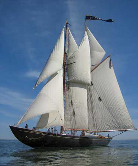 The Schooner Eleanor , launched in May 1999, was built in Kennebunkport by Captain Rich Woodman and a crew of local craftsmen to the lines of L. Francis Herreshoff’s 1935 Mobjack design. Although her hull was constructed using modern techniques, the Eleanor is in every other way a traditional gaff-rigged schooner. Spruce spars, mahogany transom, locust rails and hand carved trail boards all contribute to the beauty of this vessel. Flying four sails with a large teak cockpit and spacious cushioned cabin tops to stretch out on, the Eleanor will give you the feel of yachting in the 1930s. Captain Rich shares his grandfather’s passion for boatbuilding and carries on this tradition in the off-season by restoring and building custom wooden boats at his boat shop in Kennebunk. He has also taught wooden boat construction at the Landing School.